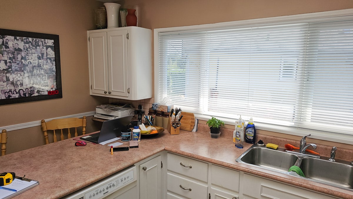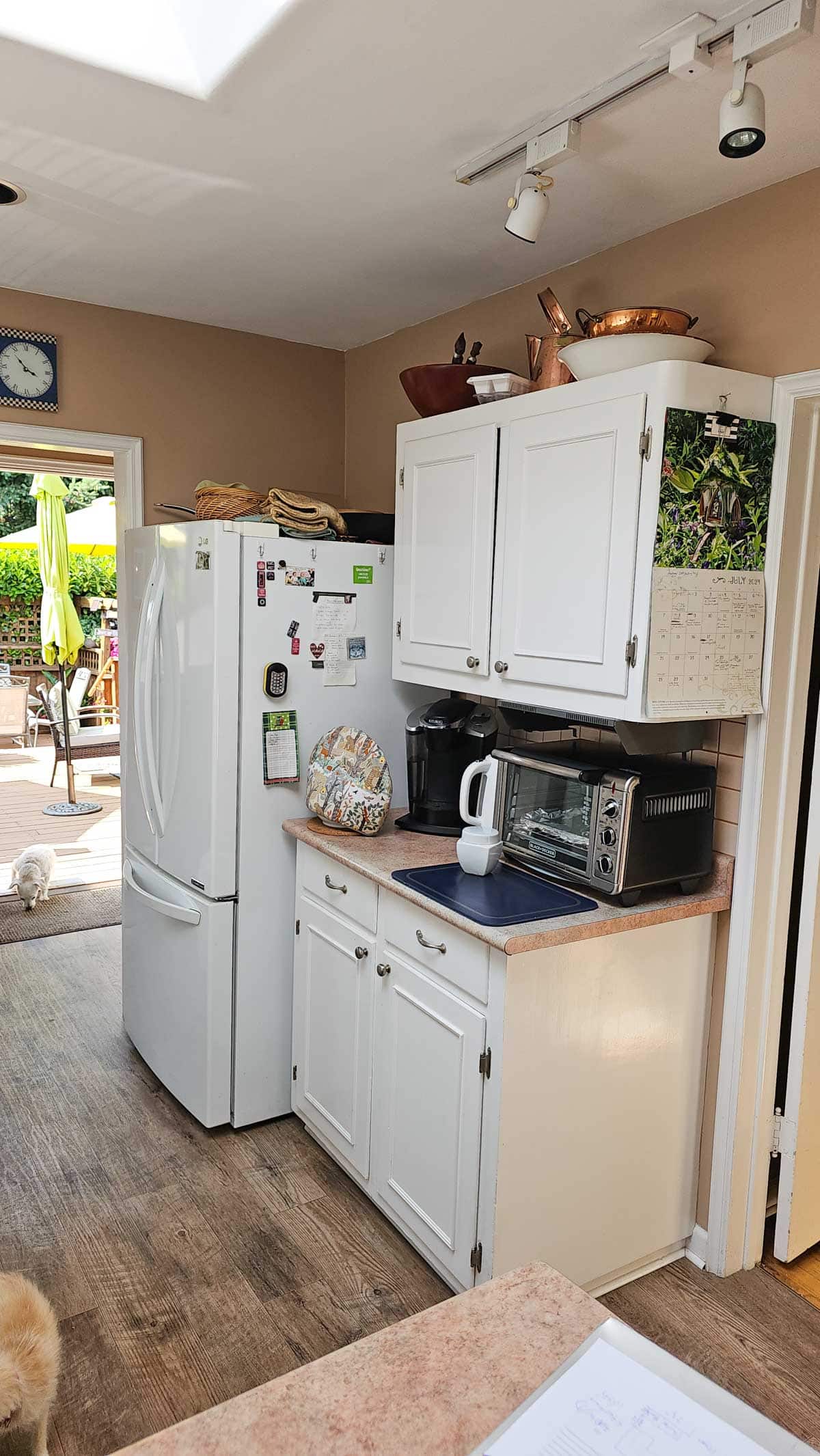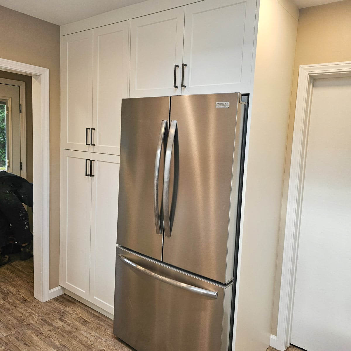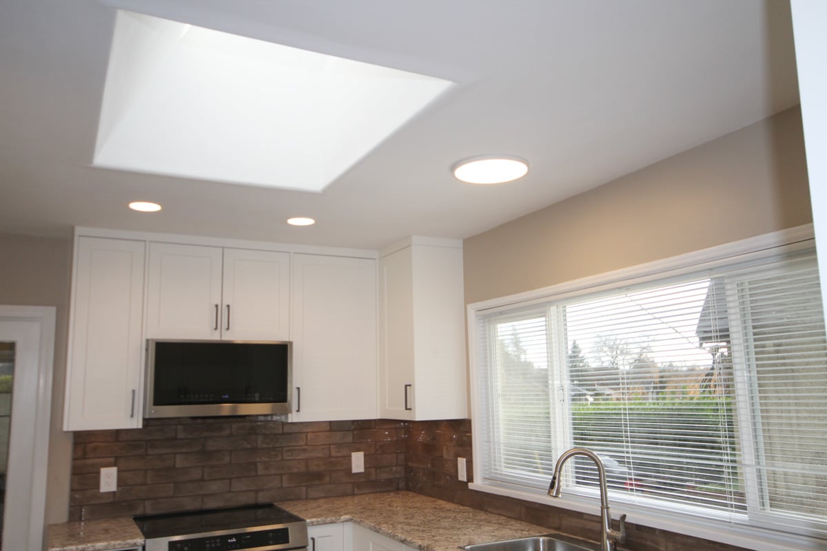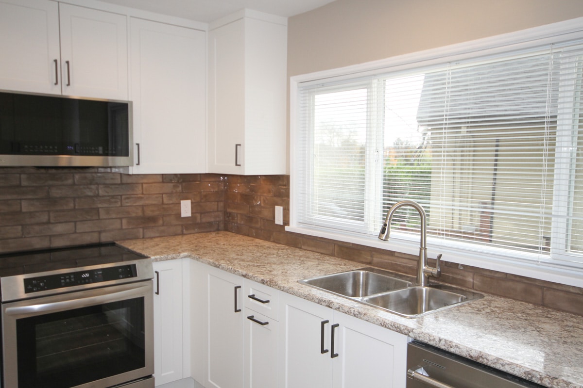 This Oak Bay kitchen renovation included a full redesign and replacement of cabinets, the addition of a dedicated laundry space, and new vinyl flooring. We updated the space with fresh cabinetry, countertops, modern lighting, paint, and trim—bringing both functionality and style back into the heart of the home.